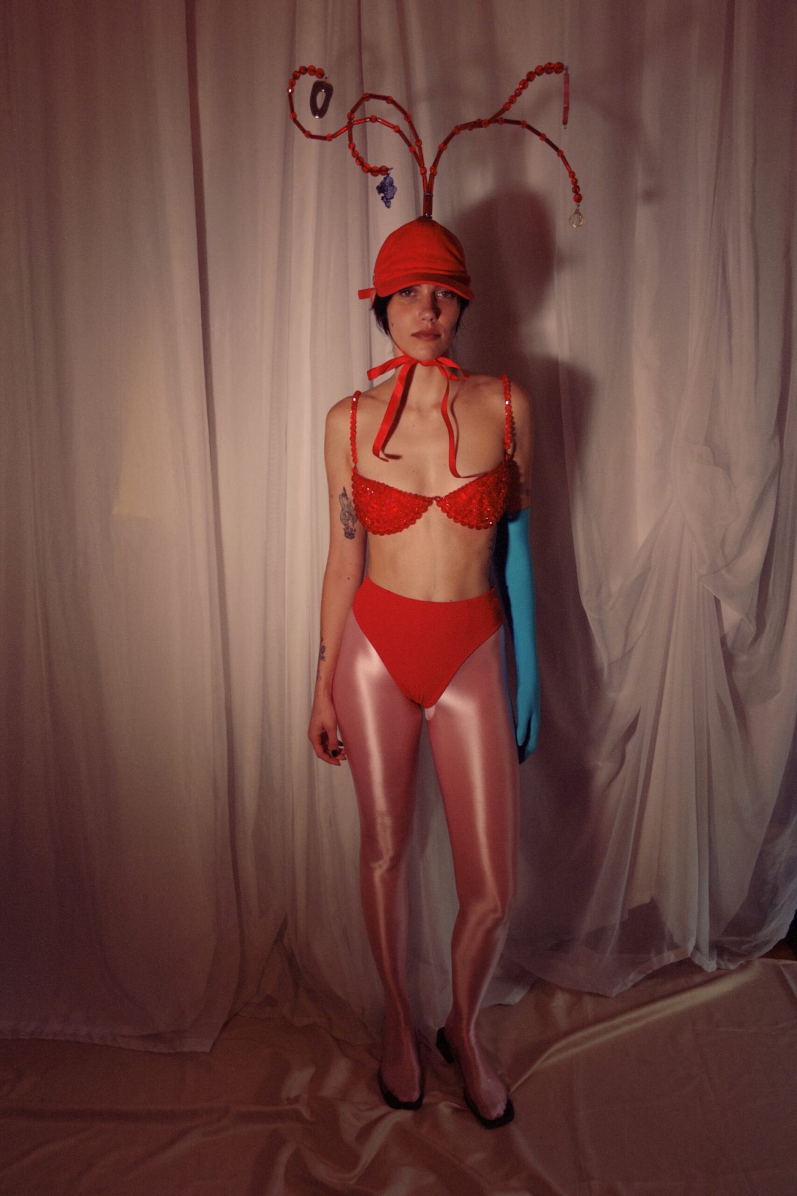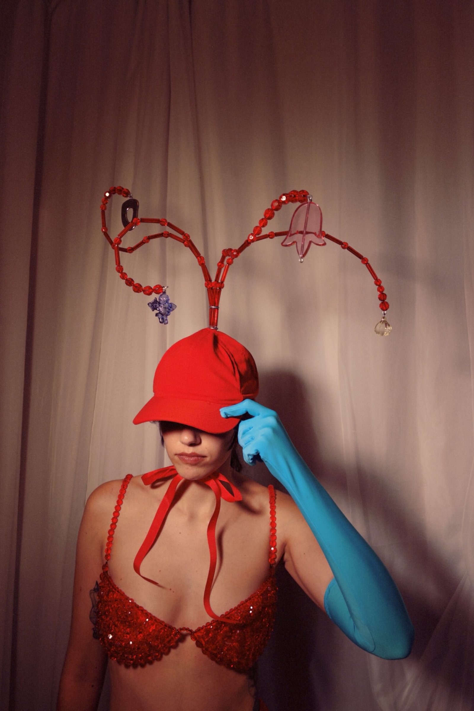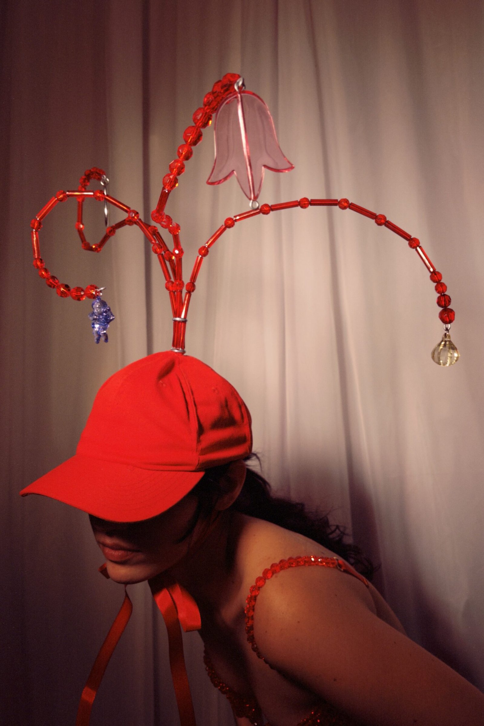 Boné de sarja 100% algodão com miçangas de acrílico tingidas manualmente.
