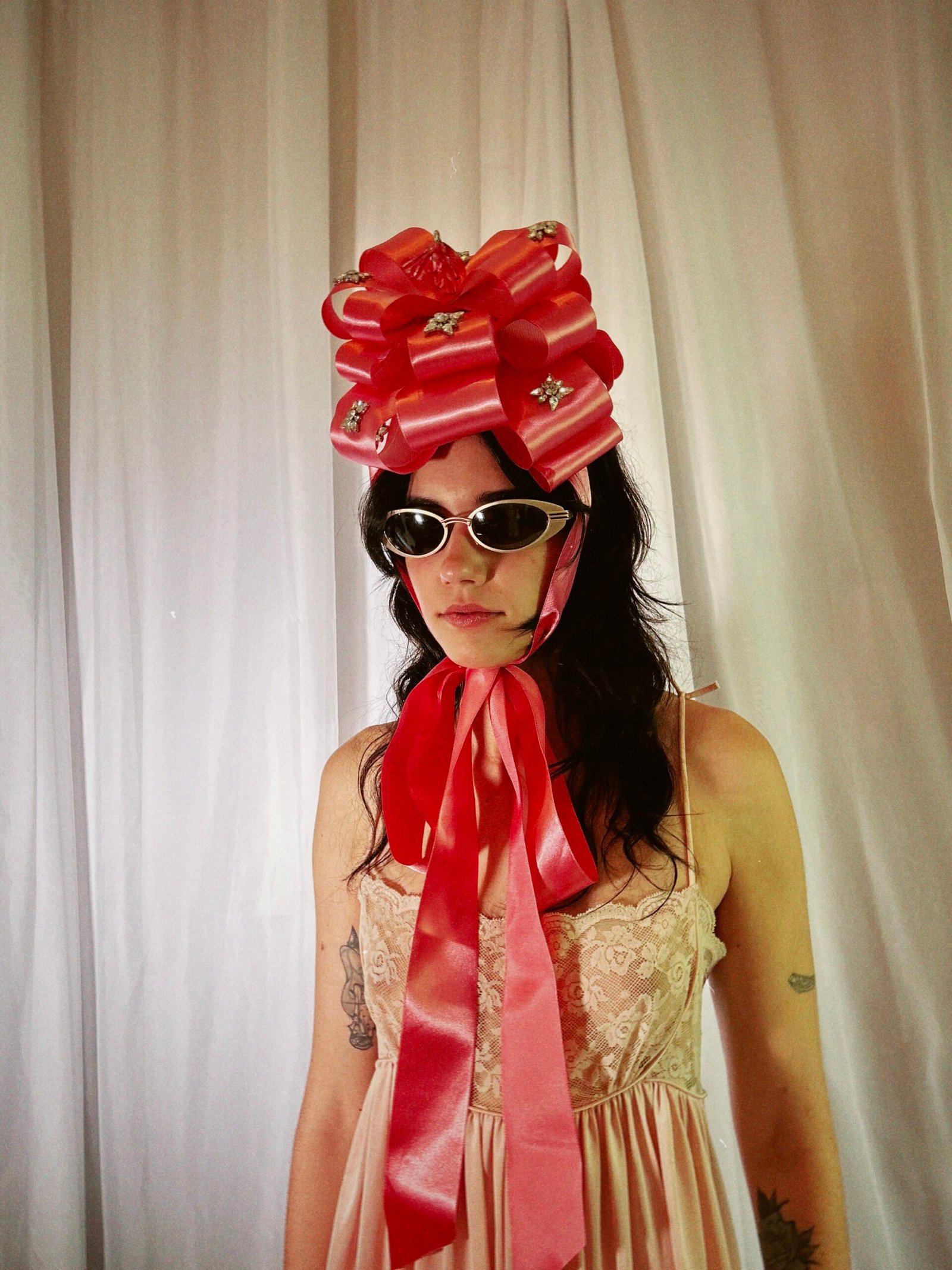 Tiara com enfeite de fita de cetim e crinol. Aplicações de cristal e fixação com pente interno e laço no pescoço.